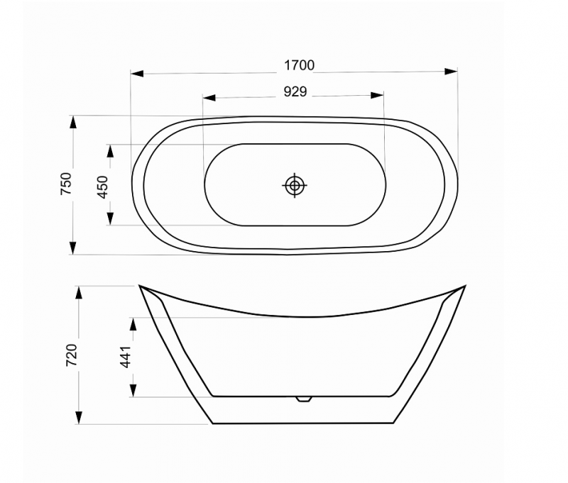 Акриловая ванна 1700*750*720мм MELADO белая, свободностоящая + сифон и метал ножками Azario